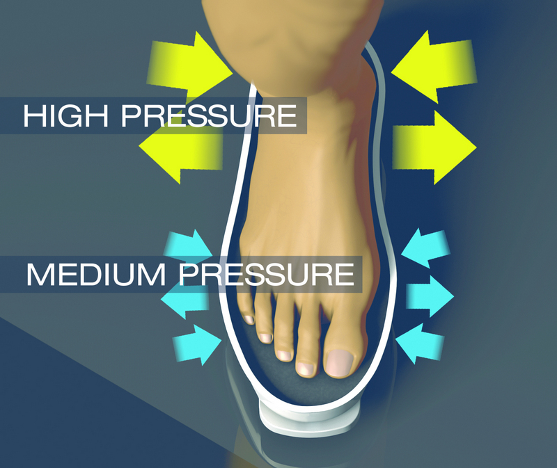 Im Vacuum Fit Ofen wird die Schale bei 80° erwärmt, der Kunde zieht den Innenschuh an, steigt in die Schale und auf der VACCUM FIT Station wird die Standposition – leichte Vorlage bie leicht gebeugten Knien, neutrale Oberkörperposition – eingerichtet. ; bei Fischer wird jetzt direkt das Cooling- und Kompressions-Pad um den Stiefel gelegt und bei dosiertem Druck wird der Stiefel abgekühlt. Für eine exakte Anpassung kann in Kombination mit der VACUUM FIT Station und dem neuen Compression Pad der Luftdruck im Knöchel- und im Vorfußbereich unterschiedlich dosiert werden ( 2ZONE VACUUM FIT). Diese Anpassung über