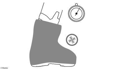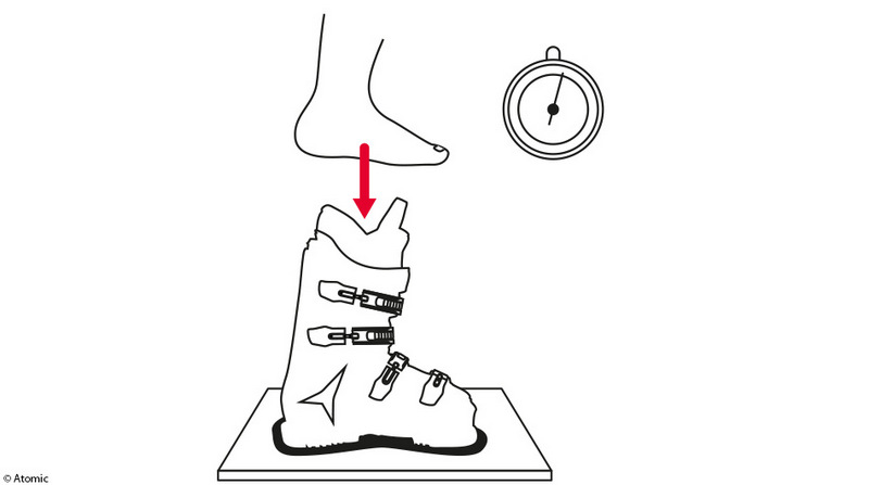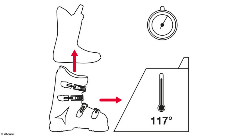 Die Schale (ohne Innenschuh, bei den Backland – Modellen bleibt der Innenschuh in der Schale) wird im speziellen Ofen 5 Minuten lang bei 117° erwärmt, wird dann auf eine spezielle Kühlmatte – Memory Fit Cooling Mat – gestellt, der Innenschuh wird eingefügt, der Kunde steigt in den Schuh und die Schnallen werden locker geschlossen, All das macht ein „Fachmann“ mit Handschuhen, die Schale ist richtig heiß, und jetzt heißt es 2 Minuten warten, in leichter Vorlage, ohne die Füße zu bewegen, die Fußform prägt sich (Atomic) in Innenschuh und Schale ein. Atomic: Durch verwendung spezieller Kunststoffzusätze wird der PU-Kunststoff (bei